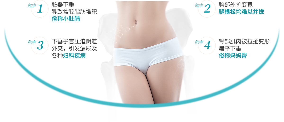 骨盆下端縫隙過大,致使盆腔內臟整體下垂。小腹凸起,脂肪頑固性堆積。所以很多產后女性無論怎樣瘦,可就是小腹容易長贅肉。