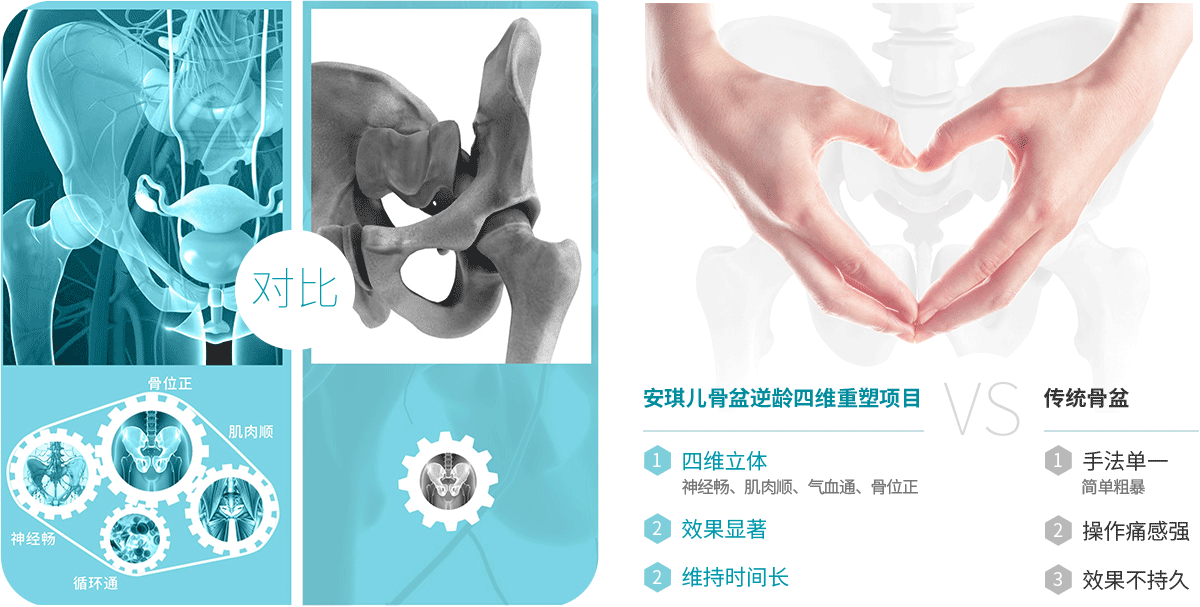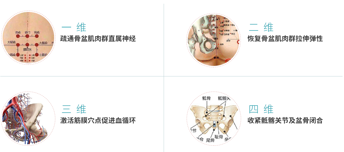 骨盆四維重塑機理:骨盆及臀部主要是由骶椎、骶髂關節(jié)、髂骨、恥骨,及臀部肌肉群、神經叢和血管組成的一個緊密連接的整體。